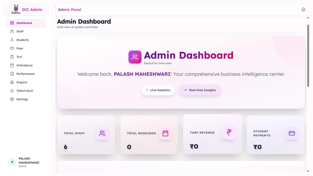 The system is designed to streamline cricket academy administrative tasks, enhance player development, and provide comprehensive oversight of academy operations through an intuitive, role-based interface tailored for cricket training environments.